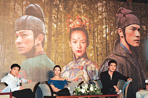 中新网7月15日电 据香港大公报报道,因母亲在北京做心脏手术而未能出席《十面埋伏》香港首映礼的章子怡,终赶及到台北为该片宣传。在昨午的记者会上,与男主角金城武、刘德华和导演张艺谋一起,畅谈拍片花絮,晚间则出席在故宫博物院举行的首映会。