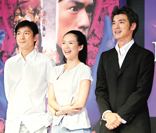 中新网7月28日电 据香港大公报报道,昨日,《十面埋伏》在东京六本木举行盛大记者会,导演张艺谋率领三位主角刘德华、金城武及章子怡出席,吸引大批传媒到访,多达五百人,非常热闹。