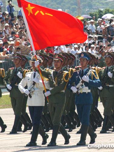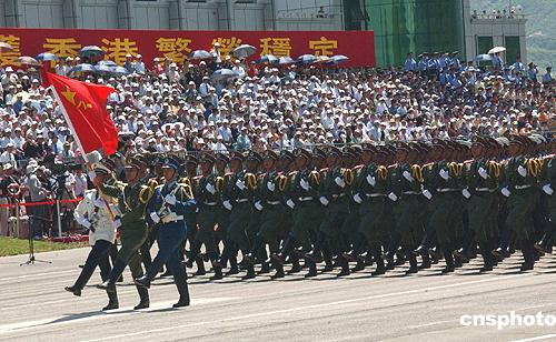 8月1日,香港回归七年来,驻港部队今天首次公开阅兵,包括政府高官、社会名流和众多第二届立法会议员在内的逾一万五千名香港市民,在新界石岗军营亲睹了陆海空三军逾三千官兵参加的队列操演。