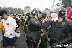 8月7日,在亚洲杯决赛中国队对日本队的比赛开赛之前,大批的防爆警察进驻北京工人体育场,确保赛场的安全。图为一名防爆警察为同伴擦汗。中新社记者:盛佳鹏