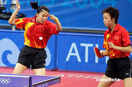 当地时间八月十八日,在雅典奥运会乒乓球女双1/4决赛中,王楠、张怡宁以4:2淘汰中国香港选手桑亚蝉、帖亚娜,率先晋级半决赛。中新社记者:张炜