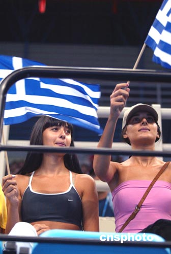 当地时间8月18日,男子柔道90公斤级比赛场边,两个漂亮的观众不停挥舞着希腊国旗助威加油。