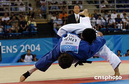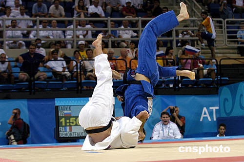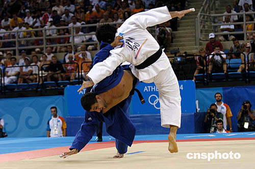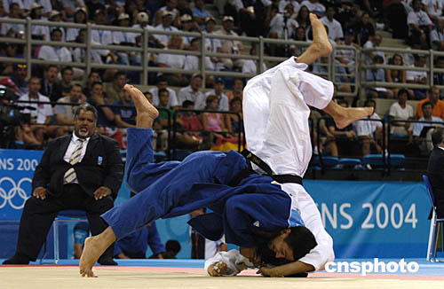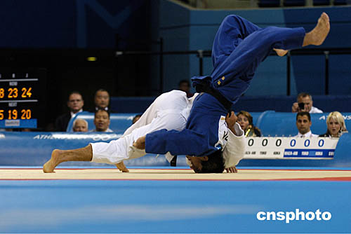 图为在当地时间18日举行的男子-90公斤级柔道比赛中的场面。选手们不时上演精彩的“武侠大片”。