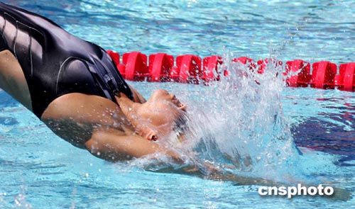 图为当地时间8月19日女子两百米仰泳比赛中德国选手Antje越入泳池的场景。