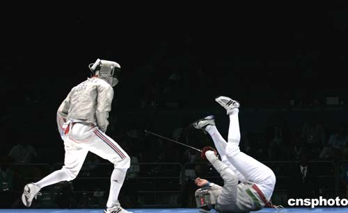 图为当地时间8月19日进行的男子击剑团体赛中,获得冠军的法国队在决赛中对阵意大利队的场景。