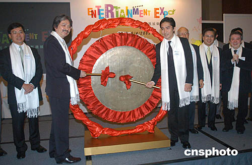 香港影视娱乐大使梁朝伟与工商及科技局局长曾俊华携手敲响铜锣,象征为活动揭开序幕。