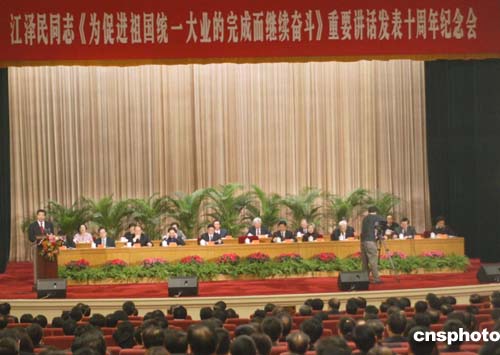 中新社北京一月二十八日电(记者耿军)北京各界人士二十八日在人民大会堂集会,隆重纪念江泽民《为促进祖国统一大业的完成而继续奋斗》讲话发表十周年。中共中央政治局常委、全国政协主席贾庆林出席纪念会并发表重要讲话。