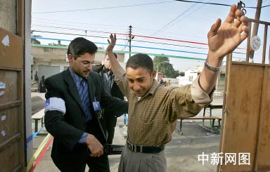 图:巴士拉选民进入投票站之前进行检查