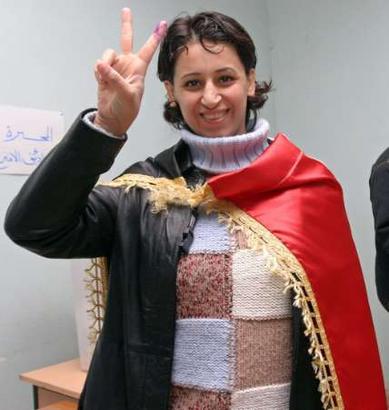 图:伊拉克妇女投票后做出胜利的手势