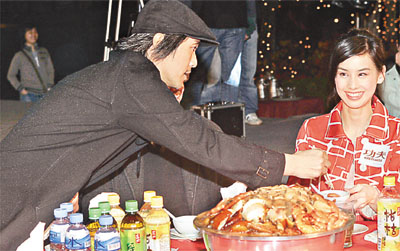 周星驰主演的电影《功夫》在各地上映均获佳绩,昨晚在奥海城露天广场筵开八十六席名为“功夫千人群雄宴”的盆菜宴招待观众,好让观众与他拉近距离,及与片中演员欢聚一番。而每席盆菜约花费八百多元。