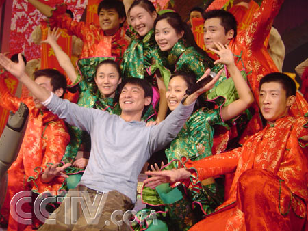 为了让刘德华尽快熟悉现场表演情况,导演组首先让前几次彩排中一直担任刘德华替身的舞蹈演员再次表演节目,在示范表演之后,刘德华手持麦克风上场,可能由于事先对节目有所准备,刘德华台上的表演、唱歌都很到位,与伴舞演员以及两个可爱的机器人配合也非常默契,彩排一次成功。但为了实现更好的演出效果,在刘德华的要求下,又进行了第二次彩排,之后刘德华及其工作人员迅速离开现场。(逯娜 高正奎)