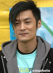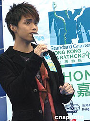 图为香港歌手张敬轩和余文乐19日在香港金紫荆广场出席2005渣打马拉松(香港)嘉年华活动﹐为观众献歌。