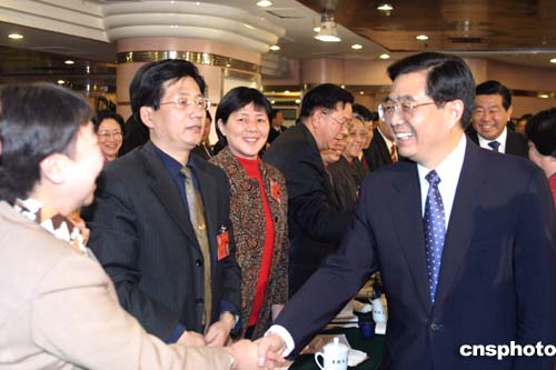 中新社北京三月四日电 中共中央总书记、国家主席、中央军委主席胡锦涛今天下午看望了参加全国政协十届三次会议民革、台盟、台联界委员,并参加联组会,听取委员们的意见和建议。他强调,我们要坚持以邓小平理论和“三个代表”重要思想为指导,继续贯彻“和平统一、一国两制”的基本方针和现阶段发展两岸关系、推进祖国和平统一进程的八项主张,继续以最大的诚意、尽最大的努力争取和平统一的前景,同时绝不容忍“台独”,绝不允许“台独”分裂势力以任何名义、任何方式把台湾从祖国分割出去。