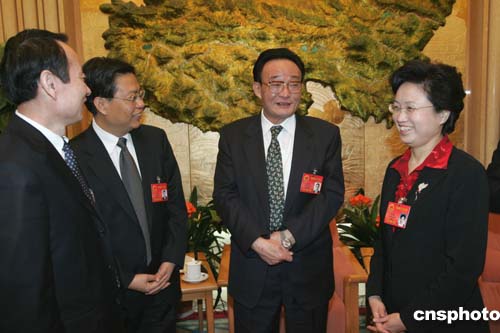 中共中央政治局常委、全国人大常委会委员长吴邦国三月九日下午与青海代表一起审议全国人大常委会工作报告与“两高”报告。图为吴邦国委员长与青海省委书记赵乐际(左二)、青海省省长宋秀岩(右一)一起交换有关西部发展的意见。作者:毛建军