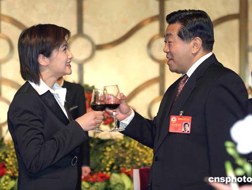 全国政协办公厅、中央统战部三月九日在北京钓鱼台国宾馆举行港澳地区政协委员招待会。香港嘉宾吴小莉向全国政协主席贾庆林祝酒。作者:王辛莉