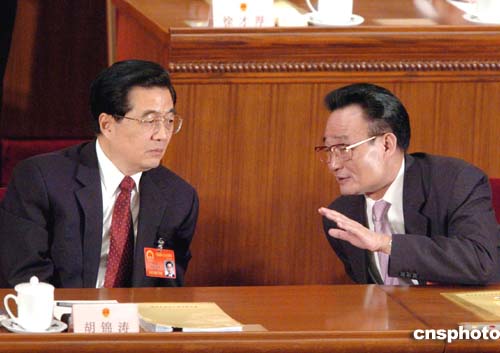 十届全国人大三次会议第四次全体大会三月十三日上午在北京人民大会堂举行,投票选举中华人民共和国中央军事委员会主席。图为胡锦涛与吴邦国在主席台上交谈。作者:陈文