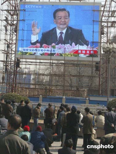 十届全国人大三次会议三月十四日在北京闭幕,在北京火车站广场,众多旅客在大屏幕前观看国务院总理温家宝回答中外记者问的现场报道。作者:钱兴强