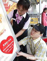 当北京肯德基深陷“苏丹红事件”的泥潭之中之际,其主要的竞争对手中国麦当劳三月二十一日再次声明:自从出现“苏丹红事件”以来,中国麦当劳餐厅的所有产品以及所有供应商所提供的原材料在有关部门的例查中都没有发现这种原料。图为北京麦当劳各餐厅贴出醒目告示请顾客放心用餐。