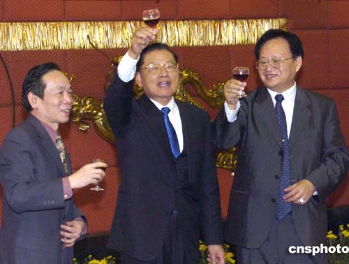 三月二十九日,中国国民党副主席江丙坤(中)率领的国民党高层大陆参访团一行在广州接受广东台商宴请。作者:罗仰明