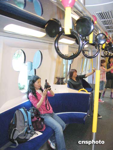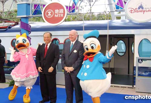 香港地铁公司总裁周松岗〔左二〕与香港迪斯尼乐园集团行政总裁罗彬深〔右二〕,二十五日共同主理世界首列迪斯尼专线列车开通仪式。该列车仅往返于欣澳站及迪斯尼站,三分半钟的车程中,游客将感受迪斯尼的奇妙体验。作者:关向东
