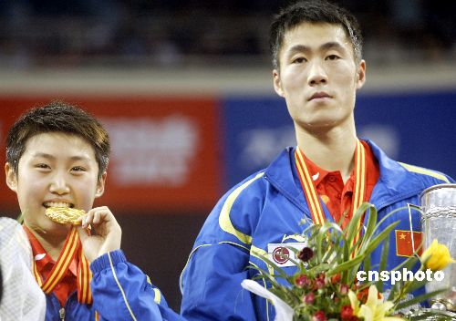 中新社上海五月四日电 (记者 王欢)昨天被中国队提前签收的混合双打金牌,今天正式归于王励勤/郭跃名下,两人以四比三战胜队友刘国正/白杨获得了本届世乒赛上的第一枚金牌。