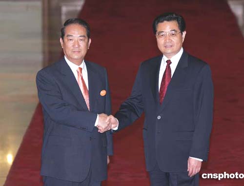 中新社北京五月十二日电 (记者刘舒凌)自人民大会堂现场报道:五月十二日下午三时许,中共中央总书记胡锦涛与亲民党主席宋楚瑜在北京人民大会堂北大厅握手。这是两党最高领导人首次会面。