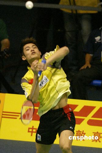 五月十二日,在北京首都体育馆进行的第九届苏迪曼杯世界羽毛球混合团体锦标赛大战进入了第三天,中国迎战实力强劲的印度尼西亚队,在男子单打的比赛中,中国名将林丹二比零战胜印度尼西亚选手索尼。图为林丹在比赛中。作者:盛佳鹏