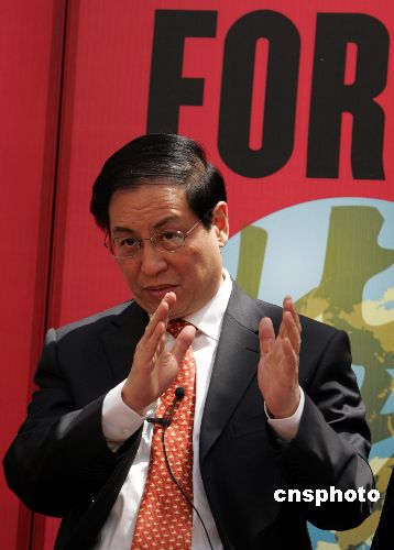 2005北京《财富》全球论坛5月18日专门举行“中国银行业改革近况”会议,中国银监会主席刘明康(左)在会上介绍:中国的银行2003年能够达到全球标准的资金只有0.5%,2004年达到了47%以上,到2006年之前80%的银行在这方面的资产将达到国际标准。作者:任晨鸣