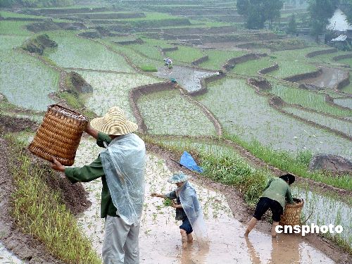 | 5月20日,重庆市云阳县红狮镇中心坝田园,当地群众正在冒雨插秧。眼下,正值三峡库区农村“双抢”(大春抢种抢收)季节,一年一度的水稻栽插处在节骨眼上。但2005年的三峡梅雨季节比常年来得早,半月前便呈现三天两头雨的“孩儿脸”气候。为了不误农时,峡江两岸农村处处可见村民斗雨整田插秧的大忙景象。据了解,早到的多雨天气对中高山及时出苗十分有利,但雨水也对秧苗固窝、劳作出行造成影响。虽然天公喜怒无常、冷热频换,人们对抢抓粮食生产的热情不减。作者:饶国君