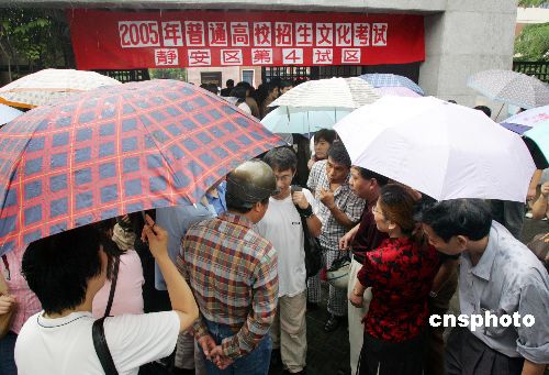 六月七日,二○○五全国高考在各地同时拉开帷幕,今年全国考生人数为八百六十七万,上海有十一万考生今起走进考场,一些家长等在考场外冒雨“陪考”。作者:汤彦俊