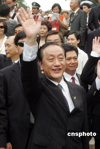 图:郁慕明向广州欢迎人群挥手致意