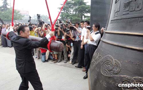 访问团一行在纪念馆的“悼念广场”举行祭奠仪式,悼念在侵华日军南京大屠杀中遇难的三十万同胞,并仔细参观了纪念馆。参观结束后,郁慕明在纪念馆挥毫写下“毋忘国耻”四个大字,还撞响了“和平大钟”。