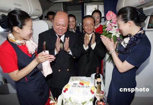 七月十日,南航机组人员在台湾新党“民族之旅”访问团从大连飞往北京的途中,送上蛋糕,祝贺新党秘书长李胜峰(左二)生日快乐,并祝访问成功。作者:毛建军