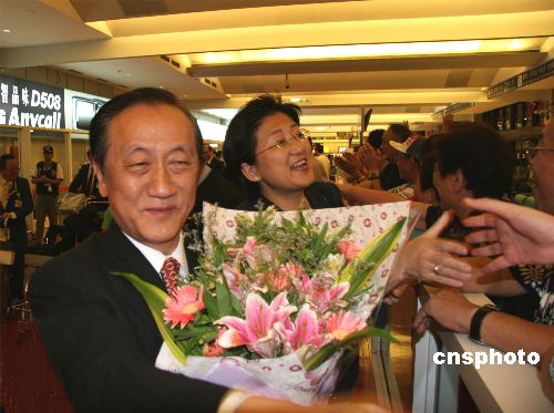 新党主席郁慕明结束在大陆八天的“民族之旅”,七月十三日晚间十点左右抵达台北,在机场受到支持群众的欢迎。作者:路梅