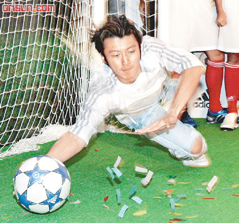 中新网7月19日电 据香港媒体报道,谢霆锋昨日在湾仔出席某活动,同场还有将于本月底迎战“红魔”曼联的港队球员,虽然霆锋手脚旧患仍未痊愈,但他仍到场做守门员,更不惜飞身挡截港队球员的射球,背脊还撞向门柱,结果成功阻截港队射球,表现相当卖力。