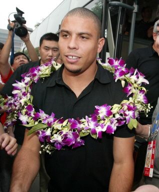 北京时间7月20日凌晨,西甲豪门球队皇家马德里飞抵北京,开始对中国进行为期四天的访问。图为罗纳尔多带上中国方面献上的花环。