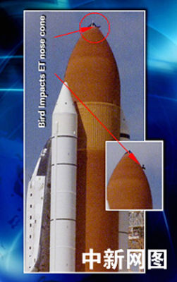 7月26日,美国“发现号”航天飞机从肯尼迪航天中心发射升空时,一只鸟在发射场附近飞过。当天下午的新闻发布会上,美国宇航局提供的一幅电视图片显示,一只鸟可能在“发现号”航天飞机发射的时候撞击了燃料箱的最前端部分。与此同时,美国宇航局证实,在26日的发射升空过程中,“发现号”上脱落下来一小块隔热瓦和一大块碎片。“发现号”底部挡热板可能有两处遭到了破坏。