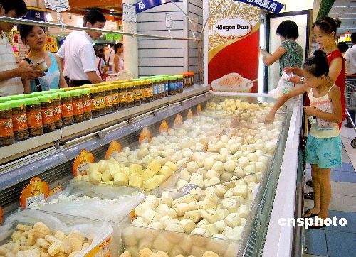 | 8月7日,中国食品科学技术学会专家委员会委员、天津商学院食品工程系教授张坤生近日指出,散装速冻食品存在明显的安全隐患。散装销售,无论是在销售人员拆除大包装散卖时,还是顾客挑选过程中,都不可避免人与食品的接触,造成细菌污染;而散装食品与空气接触面积大,还会造成水分蒸发、产品干裂与油脂的氧化、酸败等现象,同时空气中存在的微生物、病毒等很可能污染食物,导致食用不安全。图为顾客在超市选购散装速冻食品。作者:张和平