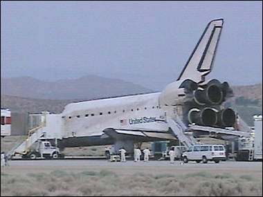 此时,航天飞机正在进行数据检测。七位宇航员将在降落约四十五分钟以后,才能走出机舱。