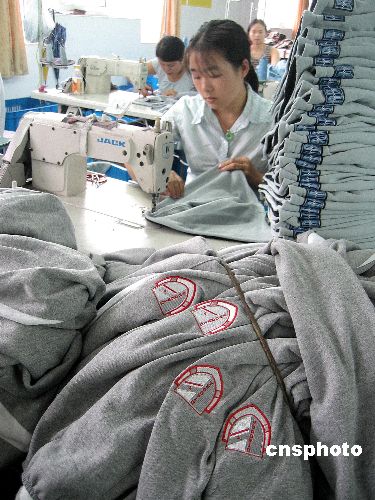 8月10日,欧盟委员会昨日表示,为避免给欧盟进口商和零售商造成损失,欧盟将允许部分超出配额的中国产套衫和长裤这两类纺织品进入欧盟市场。欧盟贸易委员曼德尔森在一份声明中表示,在今年7月11日前启运的中国套衫和长裤不管是否超出配额,都将被允许进口。图为宁波一企业正在加紧生产出口套衫和长裤。作者:张和平