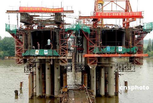8月17日,江苏扬州京杭运河大桥建设开始进入上部箱梁浇铸。该大桥是正在建设中的南京至南通公路上的重点工程,全长697米,经过15个月的建设,大桥下部结构已全面完工,上部箱梁浇铸现以每周4米的速度向两边扩展,预计大桥将在11月底合拢。作者:张丙涛