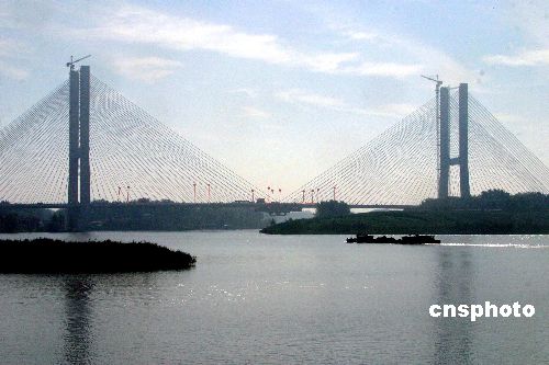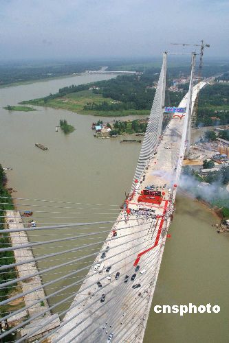 8月20日,中国主梁宽度最宽(宽度为38.6m)、承台体积第一(横桥向49.5 m×纵桥向33.1 m×厚6.0m)的五河口斜拉大桥合龙。五河口斜拉大桥是江苏省宿淮、宁淮高速公路共用段的一座大桥。该桥依次跨越京杭运河、盐河,桥梁全长2062m,工程投资约3.2亿元,双向六车道。作者:李东平