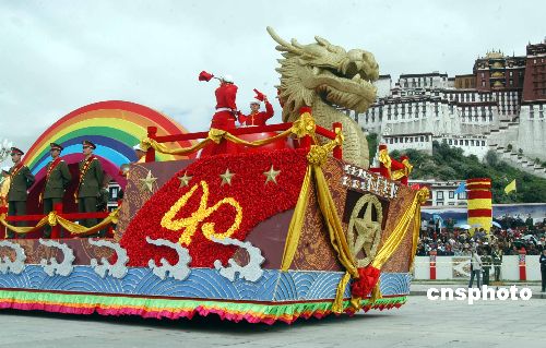 西藏自治区成立四十周年庆祝大会九月一日在拉萨布达拉宫广场举行,西藏各族各界代表组成二十二个表演方队、十八辆彩车游行表演,来自全国各地近二万人参加了庆祝大会。图为来自中国人民解放军西藏军区的彩车经过布达拉宫广场。作者:张宇