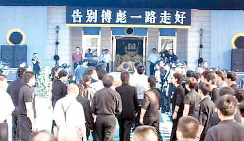 八点半,一些影视明星陆续穿过水泄不通的人群进入灵堂。张国立、邓婕夫妇、孙海英、吕丽萍夫妇、原华、刘斌、万梓良……每一个明星走过,都引起人们一阵骚动。九点二十分,和傅彪在很多戏里合作过的葛优的到来引起的哗然更是一时掩盖了正在念悼词的张国立的声音。
