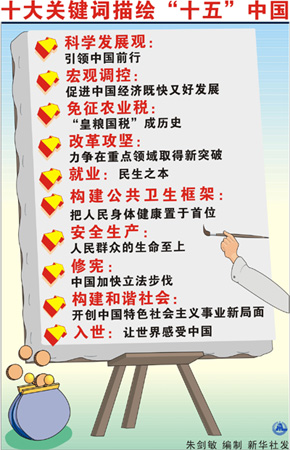 中新网9月26日电 据新华网报道, 中国“十五”计划即将全面胜利完成,“十一五”迎面走来。五年里,催人振奋的十大关键词,折射中国发展历程,描绘出一幅中国人民建设伟大祖国的恢弘画卷,激励着我们阔步跨入“十一五”。