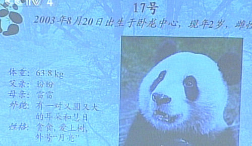 17号: 2003年8月20日出生于卧龙中心,现年2岁,雌性。体重63.8 kg。父亲:盼盼;母亲:雷雷。有一对又圆又大的耳朵和慧目。贪食,爱上树,外号“月亮”。小趣事:有一次她爬得很高,突然听见唤她吃饭,立马手脚并用迅速下树,一不小心就从树上掉了下来,在地上楞了好阵儿才缓过劲来。从此她再也不那么贪吃了。