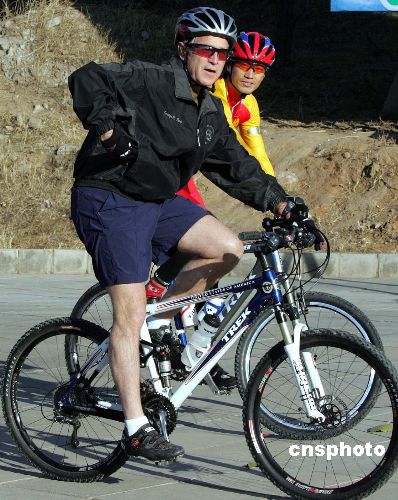 酷爱自行车运动的布什,今天要在这里骑一把山地车,提前体验北京二00八年奥运会的山地车赛场。