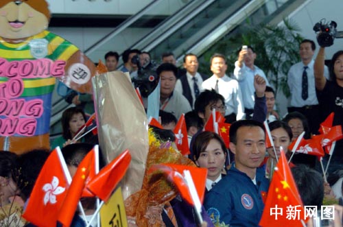 27日上午,中国神舟六号载人航天飞行访港代表团抵达香港访问,航天员费俊龙步出机场时受到市民的热烈欢迎。洪少葵 摄