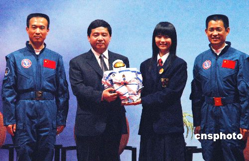 一日下午三时三十分,航天英雄费俊龙、聂海胜及中国载人航天工程航天员系统总设计师陈善广与澳门小学生手拉着手,走进澳门东亚运动会体育馆综合剧院。来自澳门四十二所中、小学的二千余名学生从阶梯座位上起立,以雷鸣般的掌声欢迎航天英雄的到来。