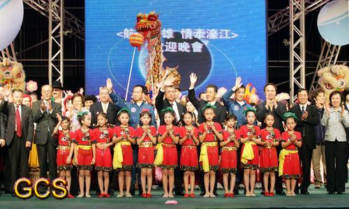 与会者不停挥动国旗和闪光棒,作为欢迎航天代表团来澳,并对“神六”顺利返航致敬,晩会气氛欢乐。